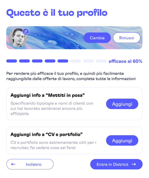 Il team di District ci ha affidato una doppia sfida: ottimizzare le conversioni delle e-mail per incoraggiare una maggiore adesione alla community da parte dei professionisti, e aumentare la partecipazione degli utenti nel condividere i propri portfolio sulla piattaforma, garantendo così un alto livello di qualità nella selezione di talenti per le aziende.